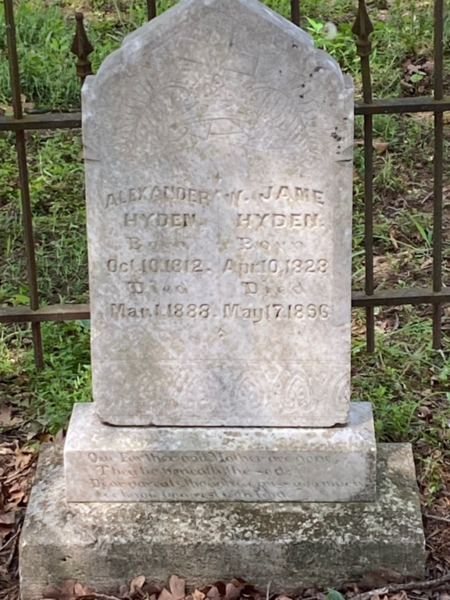 Wilmoth Jane Hyden died May 17, 1896 and was buried next to Alexander. Their graves are marked by a single tombstone and are enclosed by a wrought iron fence. Other marked graves in the cemetery are those of Eady Hyden Hughes (1865-1947) and her husband Jacob C. Hughes, Eady’s sons Luther D. Hughes (1888-1889) and Arthur Hughes (1885-1886), Rowland Hyden (1859-1870), Mary S. Hyden Ingle (1855-1881) and her daughter Lyda P. Ingle (1880-1881), and Jemima D. Hyden Rasco (1839-1895). There are also eight graves marked with rocks.