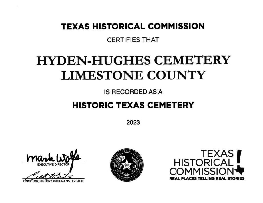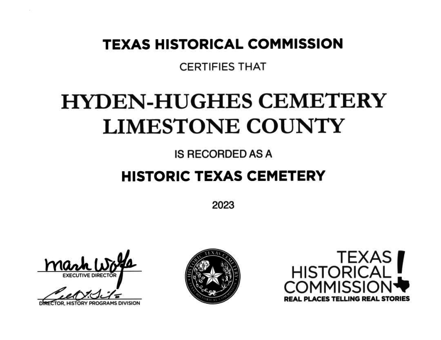 The Hyden-Hughes Cemetery is located about 10 miles south of Groesbeck on FM 937. It is a small family cemetery that contains the graves of Alexander Hyden, his wife Wilmoth Jane, and several of his descendants.