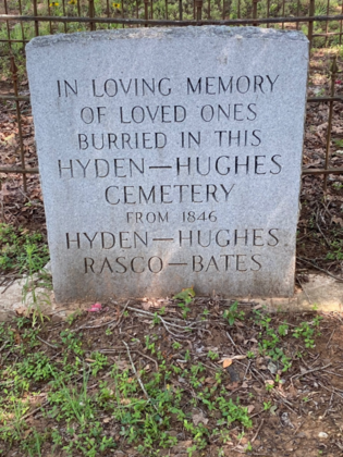 Alexander Hyden died on March1, 1888 and was buried in the family cemetery. After his death, the land was divided among his wife Wilmoth Jane and his surviving children William Alexander, Eady, Bailey, Jemima, and Lydia. Eady inherited tract three, which contained approximately 40 acres. The cemetery was located on this tract. Eady and her husband, J. C. Hughes, sold the property to E. D. and M. A. Slaughter on December 17, 1895. They later sold it to Sol Nussbaum and Louis Scharff of the Nussbaum & Scharff firm on October 22, 1903, who later sold it to B. L. Lenamon on September 17, 1904. Mr. Lenamon and his wife deeded the property to their daughter, Lillian Engram, on November 10, 1917. The Hyden-Hughes Cemetery was set aside as a cemetery on October 29, 1926 when Lillian and her husband, J. E. Engram, deeded 1/7 of an acre on which the cemetery was located to J. C. and Eady Hyden Hughes, trustees of the “Alexander Hyden Family Cemetery.”