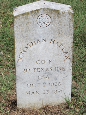 During the Civil War, Jonathan served in Company F., 20th Texas Infantry Regiment of the Confederate Army. This regiment was assigned to the Trans-Mississippi Department and served in Texas, performing guard duty along the coast from Galveston to the Sabine River.